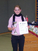 Auch beim anschließenden A-Jugendturnier startete Tina Weber mit drei Siegen in der Setzrunde und kam so ungefährdet in die Finalrunde der bis zu vier Jahre älteren Gegnerinnen. Hier schaffte sie es mit Eifer und Einsatz bis ins Halbfinale und musste sich dort aber mit 8:15 von Miriam Reuter (FC Kassel) ausbremsen lassen,was schließlich den dritten Rang bedeutete. |